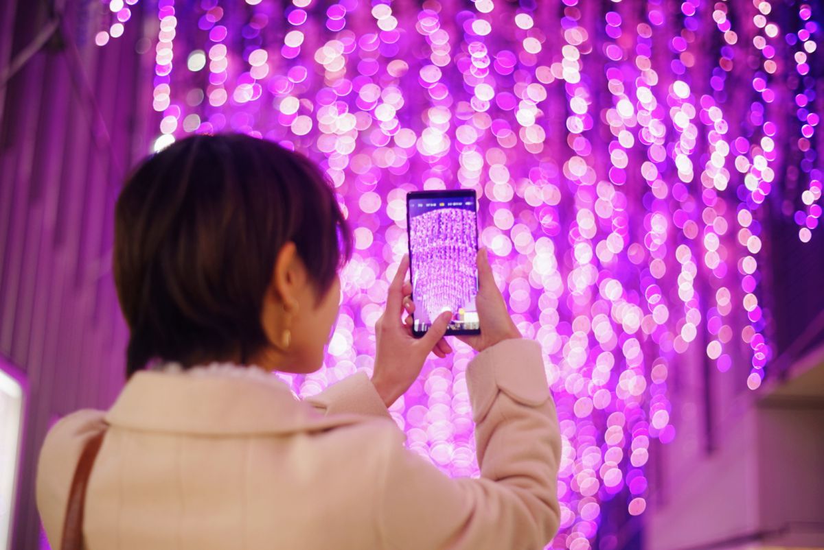 この写真は、モザイク坂の上から少し低い位置から撮影しました。坂下よりも坂上からの方が、イルミが奥に続いているように撮れますよ。