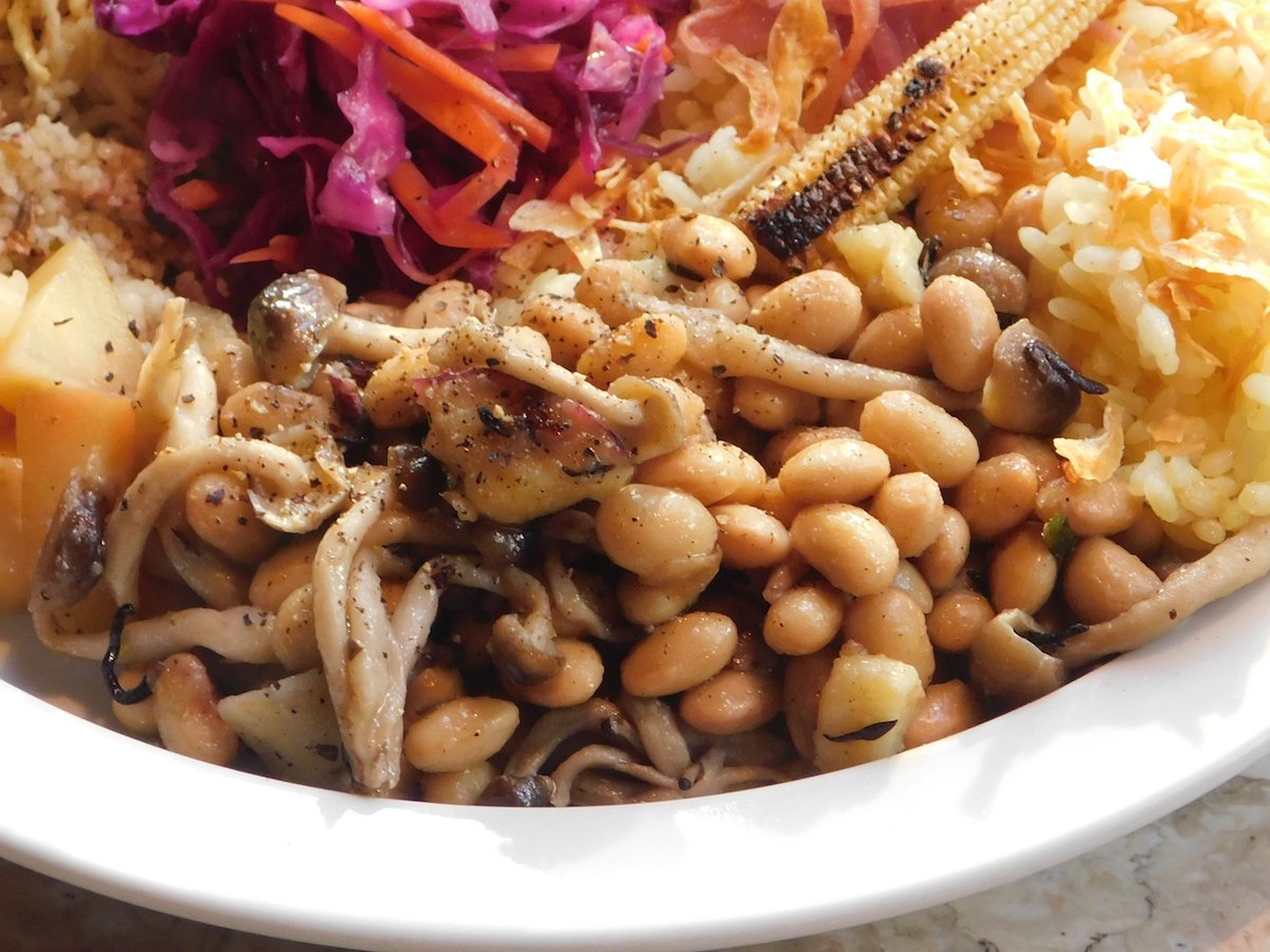 この日のブッダボウルは、10種類以上の野菜を使用。カレー味の切り干し大根や、紫キャベツと人参のコールスロー、紫玉ねぎのピクルス、焼きヤングコーンなどが、素材を生かした味付けで添えられています。