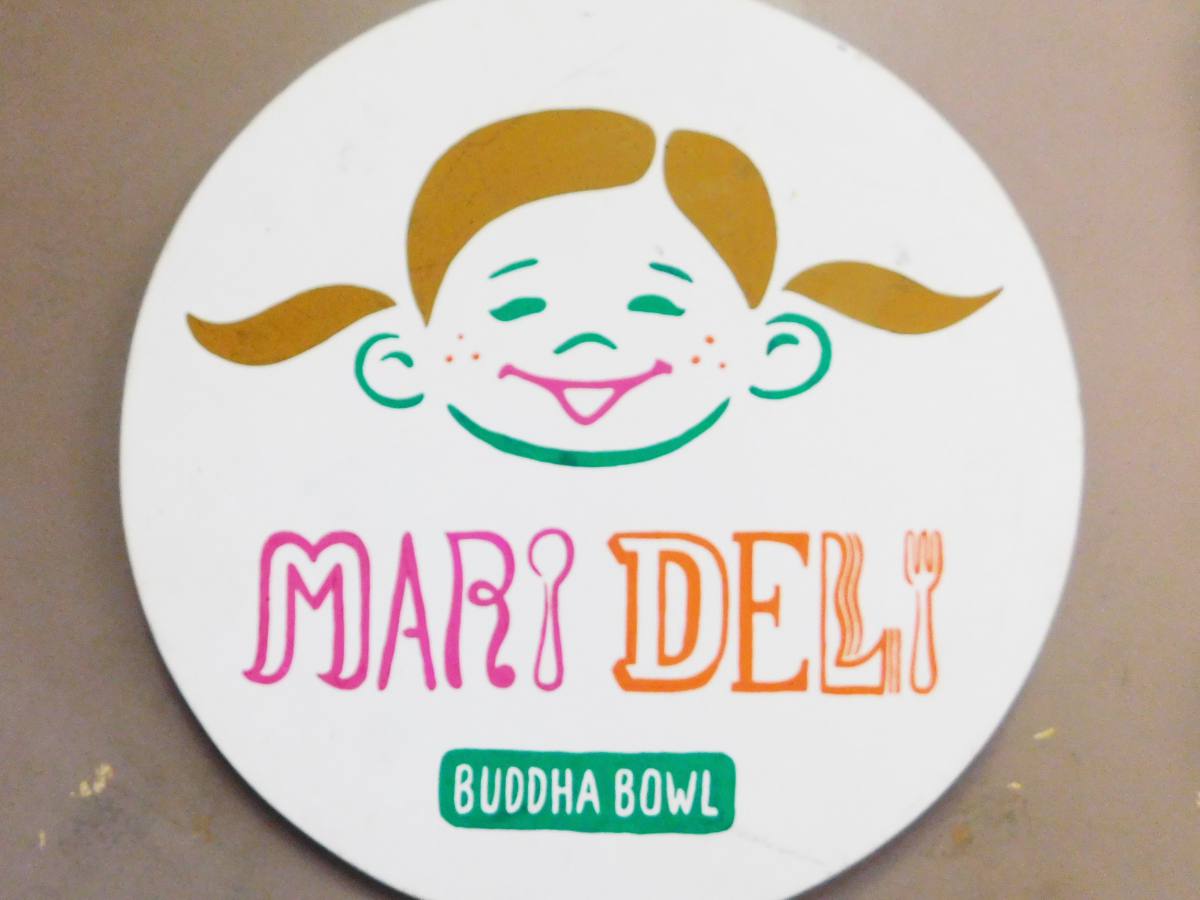 恵比寿駅と代官山駅のほぼ中間に位置し、それぞれから徒歩5分ほどのところにブッダボウルの専門店「マリデリ」はあります。ドアにかかったかわいらしいプレートがお出迎え。