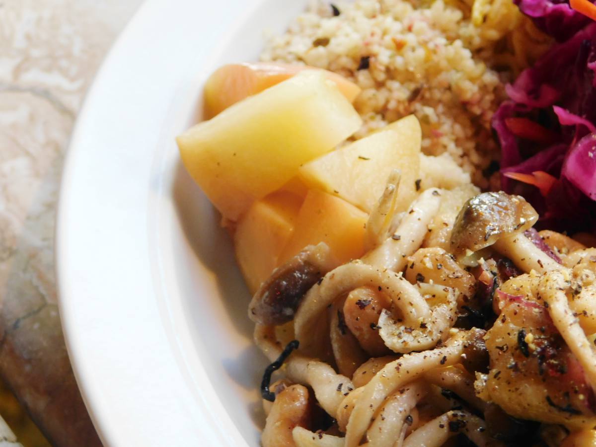 さらに煮リンゴや、エディブルフラワーの入ったクスクスもイン。すべてのデリを混ぜ合わせたときに一体となるように、味の濃いもの、薄いもの、しょっぱいもの、甘いもの、歯ごたえのあるもの、やわらかいものがバランスよく盛り付けられています。