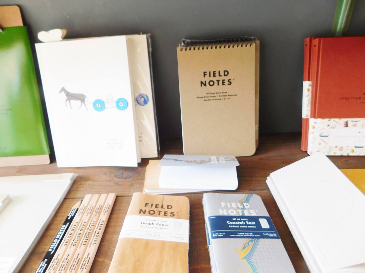 まずは、売れ筋ナンバー1のノート「FIELD NOTES」をご紹介。こちらのシリーズは、ノートのほかに鉛筆やペンなど8種類ほどのアイテムが揃います。(CHERRY GRAPH1620円(写真手前中央左)、限定Coastal PAD2052円(写真手前中央右)ほか)