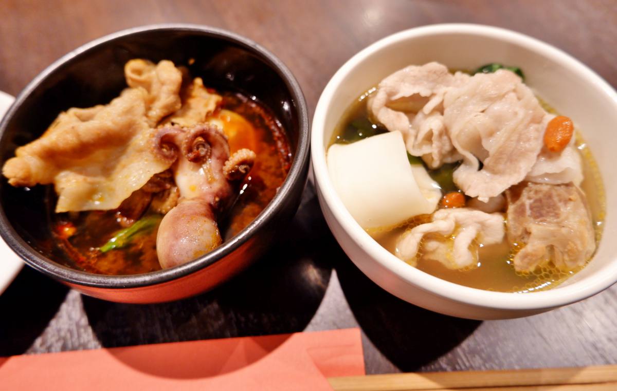 いよいよ、マーラースープ(右)と薬膳スープ(左)に、加藤ポークの肩ロースやバラ肉、海鮮やフカヒレまで豪快に投入していきます!