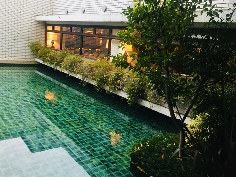 レストランの中心は、エメラルドグリーンのプールに囲まれたテラス席になっています。海を思わせる上品な色はずっと眺めていたい美しさです。
