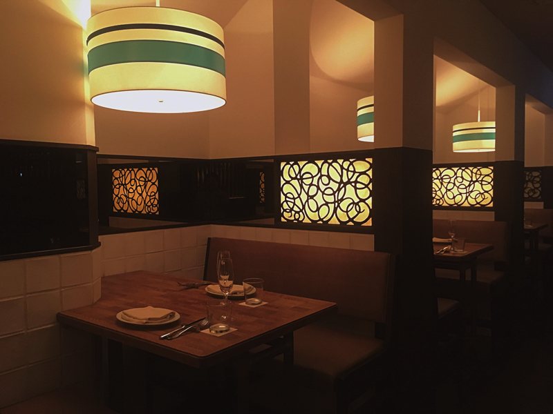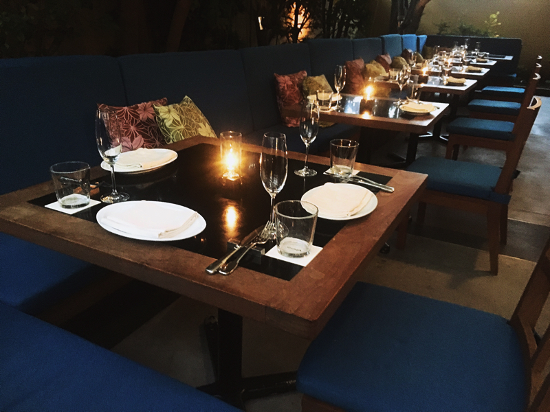 テラスを抜けてさらに奥へ進むと、半テラス席がずらり!ロイヤルブルーのソファに、ブラックとブラウンのシックなテーブルが並びます。キャンドルライトが灯った席で、ワインと一緒に地中海料理をつまむ…なんて素敵ですね。
