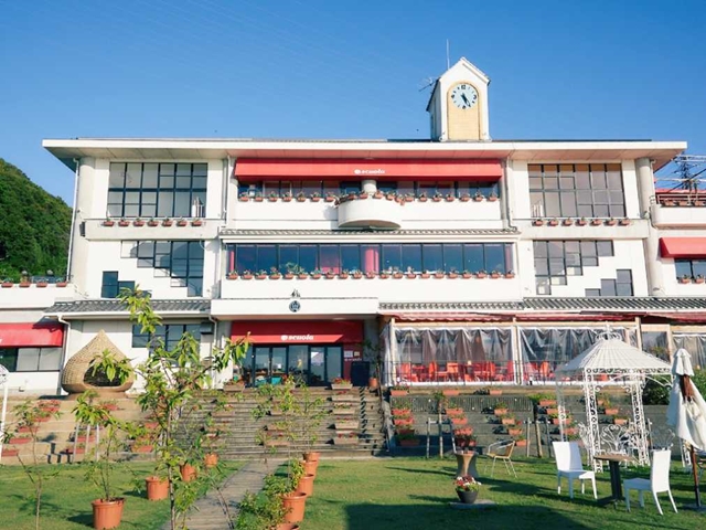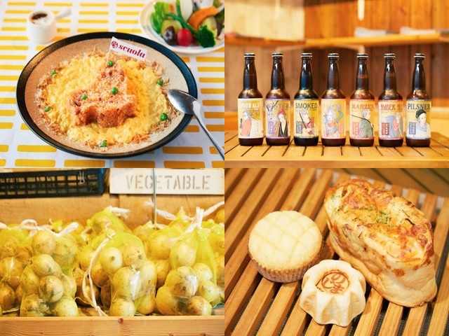 のじまスコーラは、閉校した小学校の建物をリノベーションした施設。よーく見ると、時計台や窓枠など、どこか懐かしいデザインをしていることに気づくはず。建物は小学校でも、中には本格的なレストランやカフェ、特産品が並ぶマルシェ、校庭に作られたミニ動物園など、おいしくて楽しい施設がぎゅっとつまっています。たっぷり食べて、いろいろ買って、のんびり遊んでいきましょう。