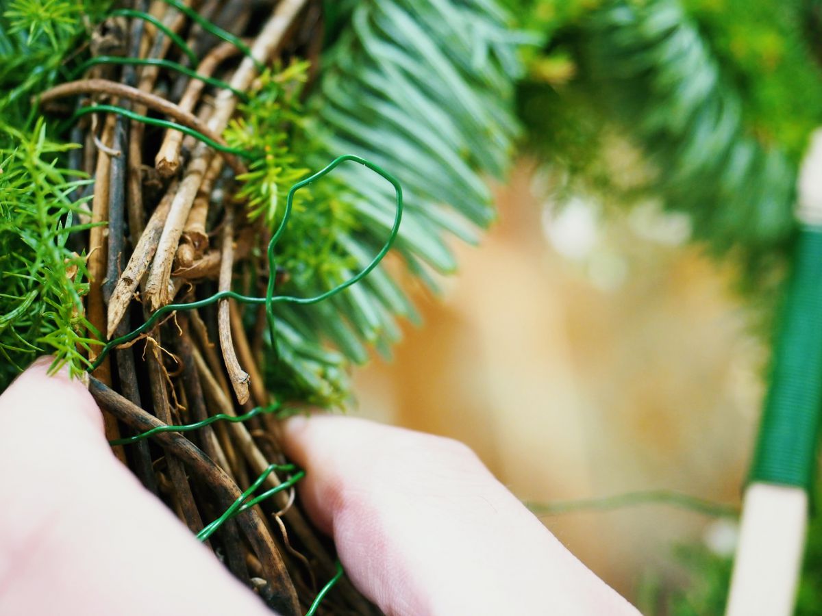 初心者が苦戦しがちなのが、ワイヤーを巻きつけていく作業です。右手でリースベースを持ち、左手のみを使ってワイヤーをリースの中心に通し、キュッとおさえるのがポイント!最初は難しく感じますが、慣れればテンポよく進むようになりますよ。