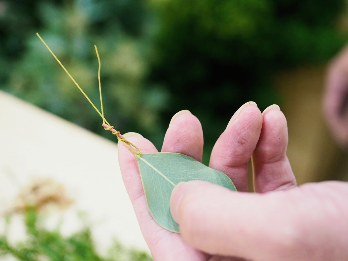 ユーカリポポラスなどの葉を使う場合は、細いワイヤーを巻きつけて差し込みましょう。小さな素材や枝のない素材も、同様にワイヤーを使えば扱いやすくなります。