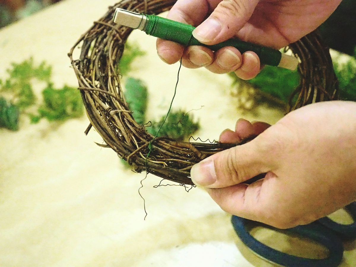 まずは「リースベース」にぐるりと「リースワイヤー」を巻きつけるところからスタート。ここから、自分で切り取った素材を時計回りにどんどん盛り込んでいきます。