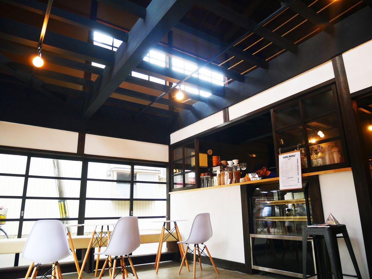 中に入ると、町家のデザインを活かした現代風のカフェスタンドがお出迎え。梁を超える高天井も開放感があり、2階の窓から注ぐ光でぽかぽか。ほっと心落ち着く日本建築の中にコーヒーの香りが漂う空間は居心地がよく、ついつい長居してしまいそうです。