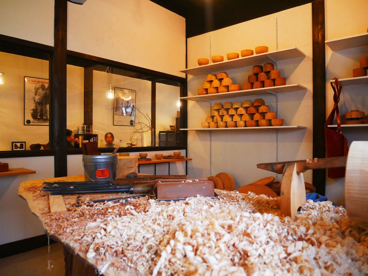 このカフェ一番の注目は、なんといってもお店の中に工房があること!石川らしいものづくりの作業風景を見るため、県内外を問わずたくさんのお客さんがいらっしゃっています。中で作業に勤しむのは木地師であり漆作家の「田中瑛子」さん。前衛的な作風で注目され、海外でも活躍する職人さんなのだとか。「山中漆器」は非公開の工房が多いので、ガラス越しに見る作業風景そのものがレアなんですよ!