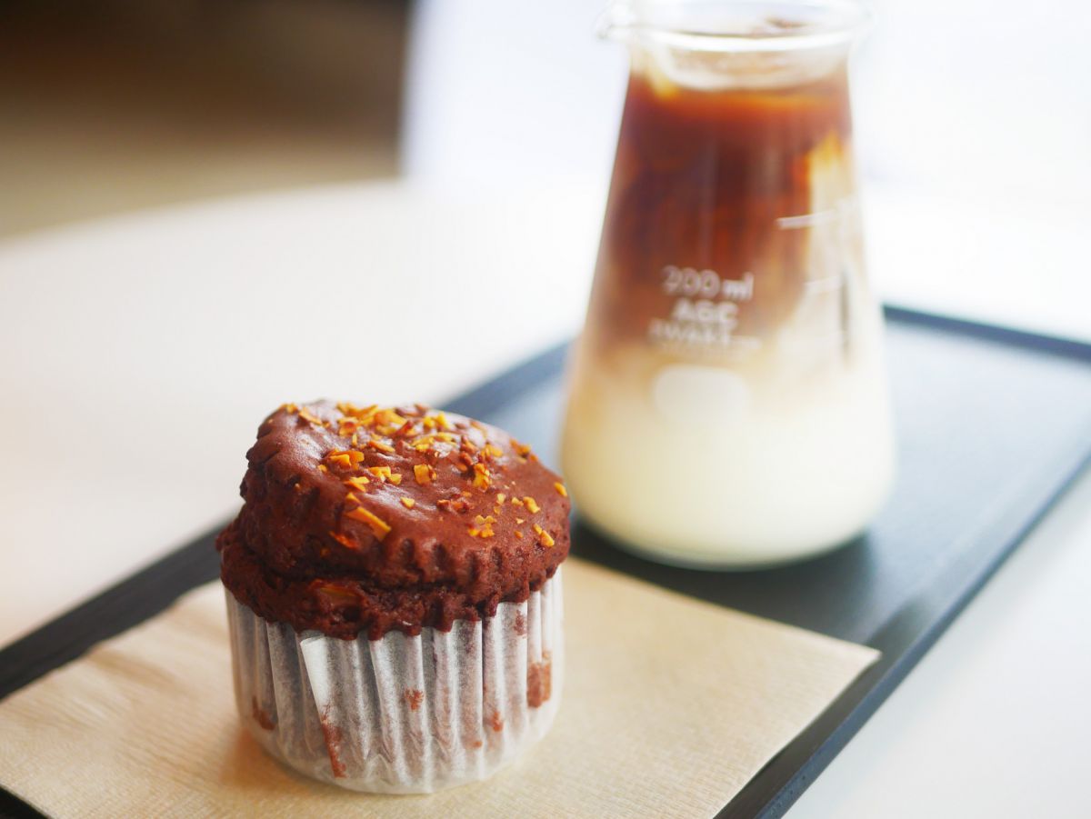 オススメは日替わり「マフィン」のドリンクセット(700円)。この日のチョコマフィンは、ビターチョコをたっぷり使っていて、濃厚だけど甘すぎない味わいです。セットでオーダーした「アイスカフェラテ」はビーカーをグラス代わりに。こういうところに店主の遊び心を感じて、思わず頬が緩みます。