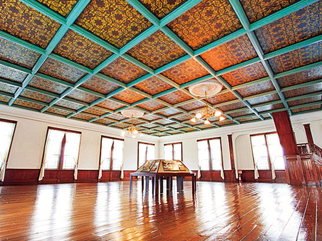 明治37年(1904)に建築された旧第五十九銀行本店本館の建物。ルネッサンス風の建築は、風合いのある漆喰の壁がレトロ気分を盛り上げてくれます。そして、一歩足を踏み入れれば、そこにはつやめく飴色の内装が!天井の金唐革紙(きんからかわかみ)やシャンデリアなど、とってもレトロでおしゃれです。