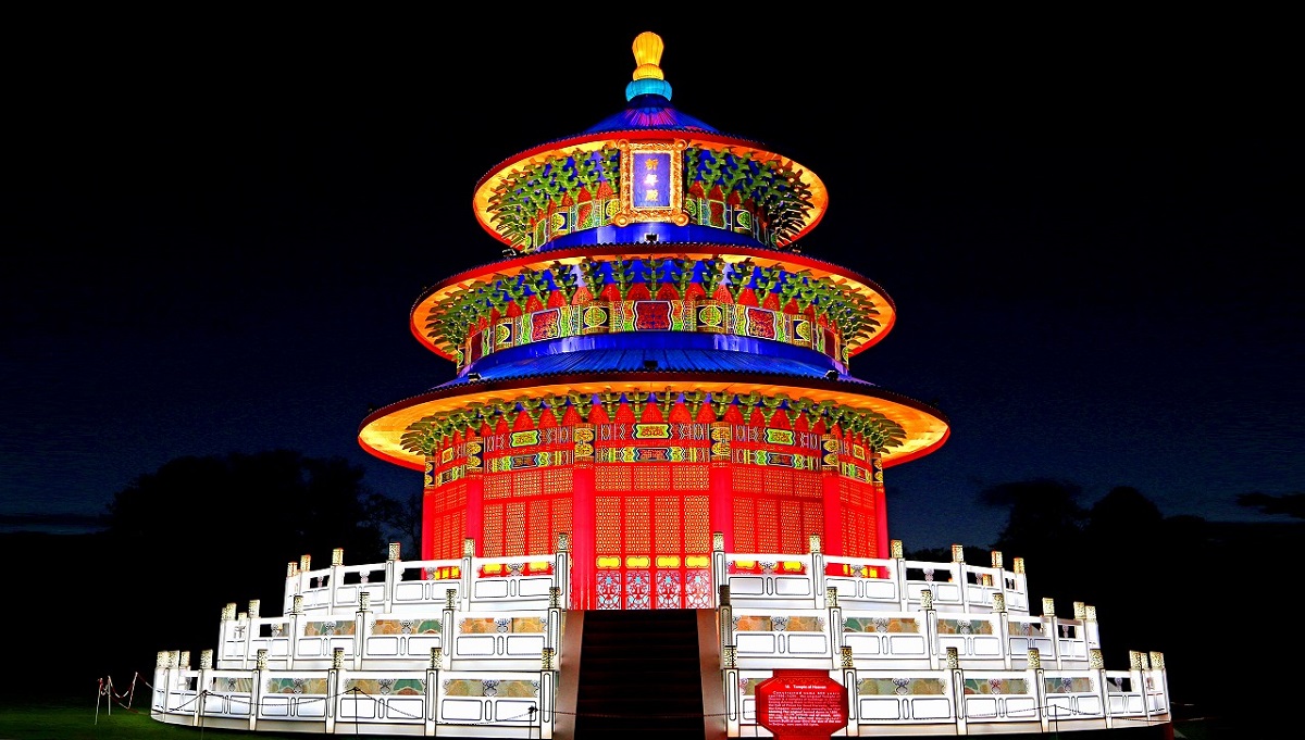 中国北京に実在する世界遺産「天壇」を原寸大(直径18m×高さ12m)で再現した作品は存在感たっぷり。鮮やかな色合いも夜の会場にうつくしく映えます。