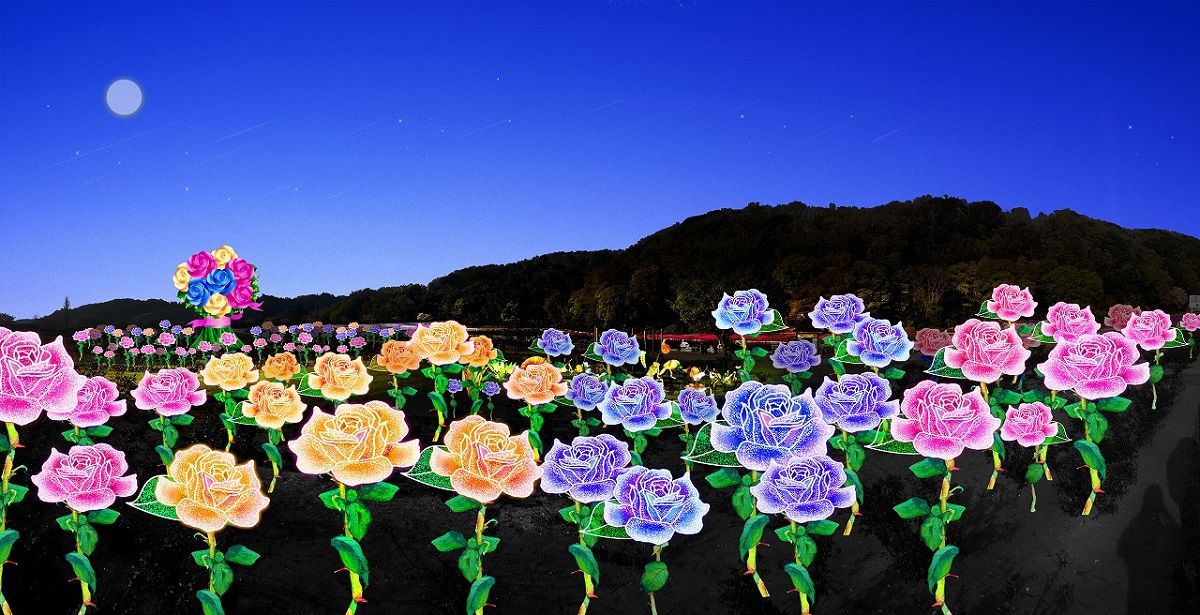高さ1.5mのバラ300本が浮かぶ「バラの海」では、色とりどりのランタンのバラが咲き乱れます。鮮やかに灯る夜の花畑はとってもロマンティック!