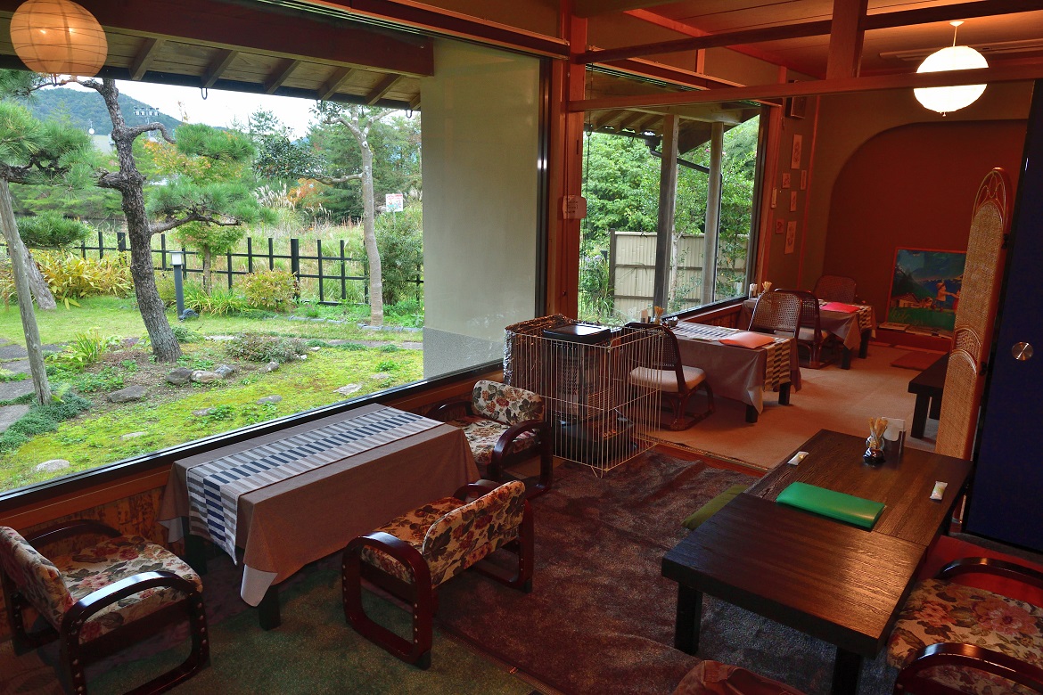 カフェスペースは、靴を脱いで上がる和の空間。おばあちゃんの家に遊びに来たような、ほっこりとくつろげる雰囲気です。目の前の大きな窓から立派な和風庭園を眺められます。