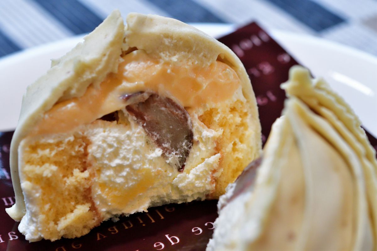 モンブランの中は生クリームとカスタードクリーム、栗の甘煮が包まれたロールケーキで、上から和栗のペーストをたっぷり絞ります。甘さはやや控えめで、栗の味わいをしっかり感じられます。