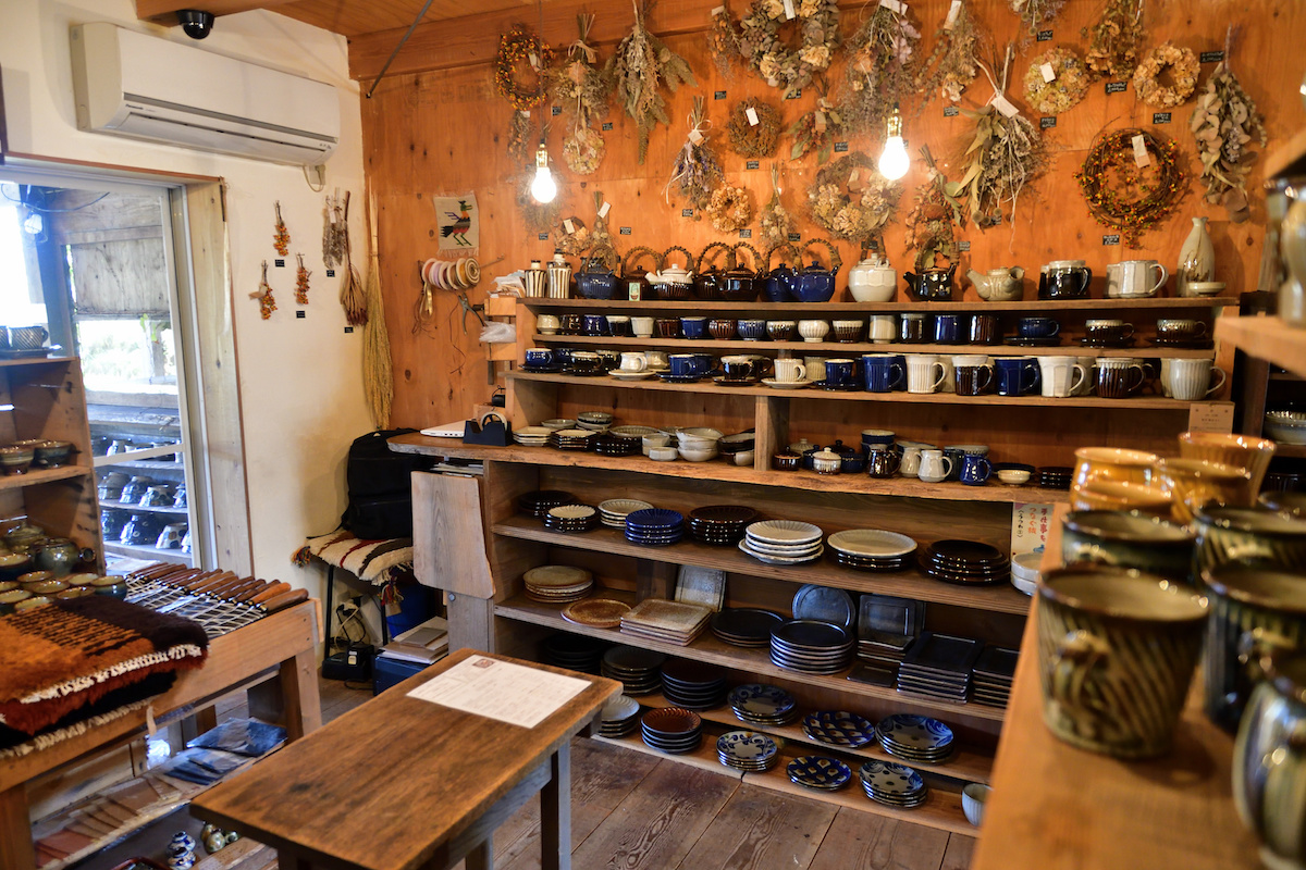 1階にあるショップスペースには、全国の窯元を巡って買い付けた器や、沖縄の島包丁、かわいらしいコースターにドライフラワーなど、手仕事の商品がずらり。