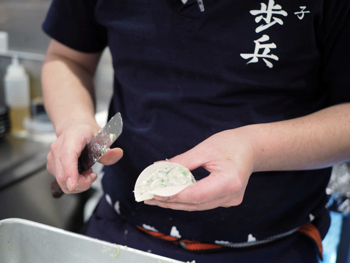 小ぶりながら、餡はたっぷり皮のぎりぎりまで。カウンター席では、目の前のオープンキッチンで次々とぎょうざが包まれていく様子を見ることができます。まさに職人技!
