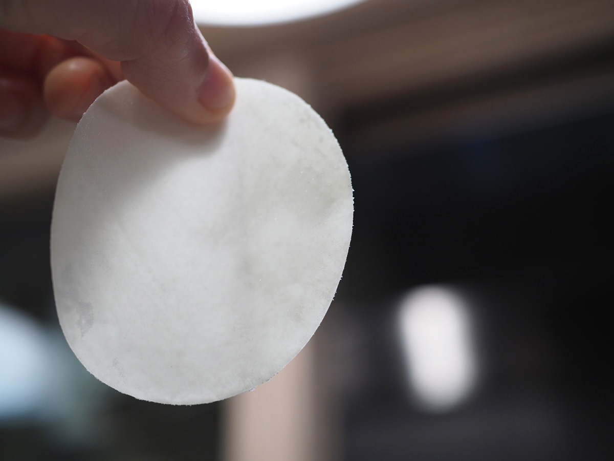 注目すべきは繊細な薄さの皮です。カリカリの焼き目のヒミツは、季節ごとに温度や湿度に合わせて配合を変えるこの皮にあり。まるでレースカーテンのように電球の光が透ける薄さに驚きます。この薄さゆえに包み置きはできないので、焼く直前に包みます。