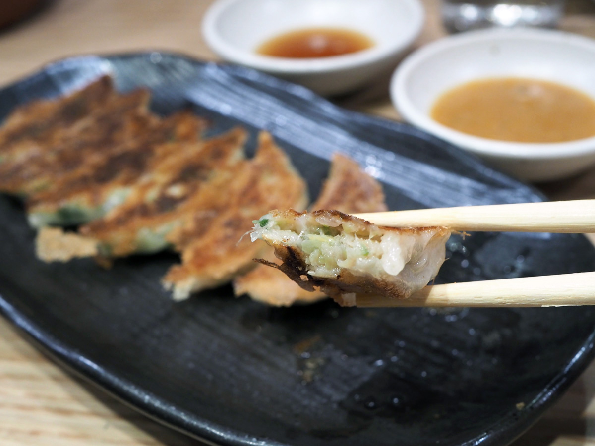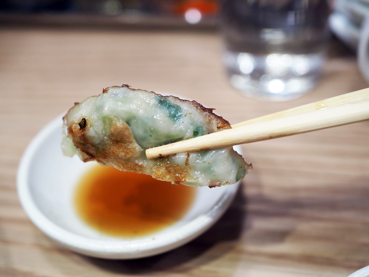 さっぱり酢醤油でいただくのがおすすめとのこと。ニラが透けてみえるほどたっぷり入っています。カリっとした食感とニンニク・ニラの旨味はまさにおつまみ…!思わずビールがほしくなる味です。