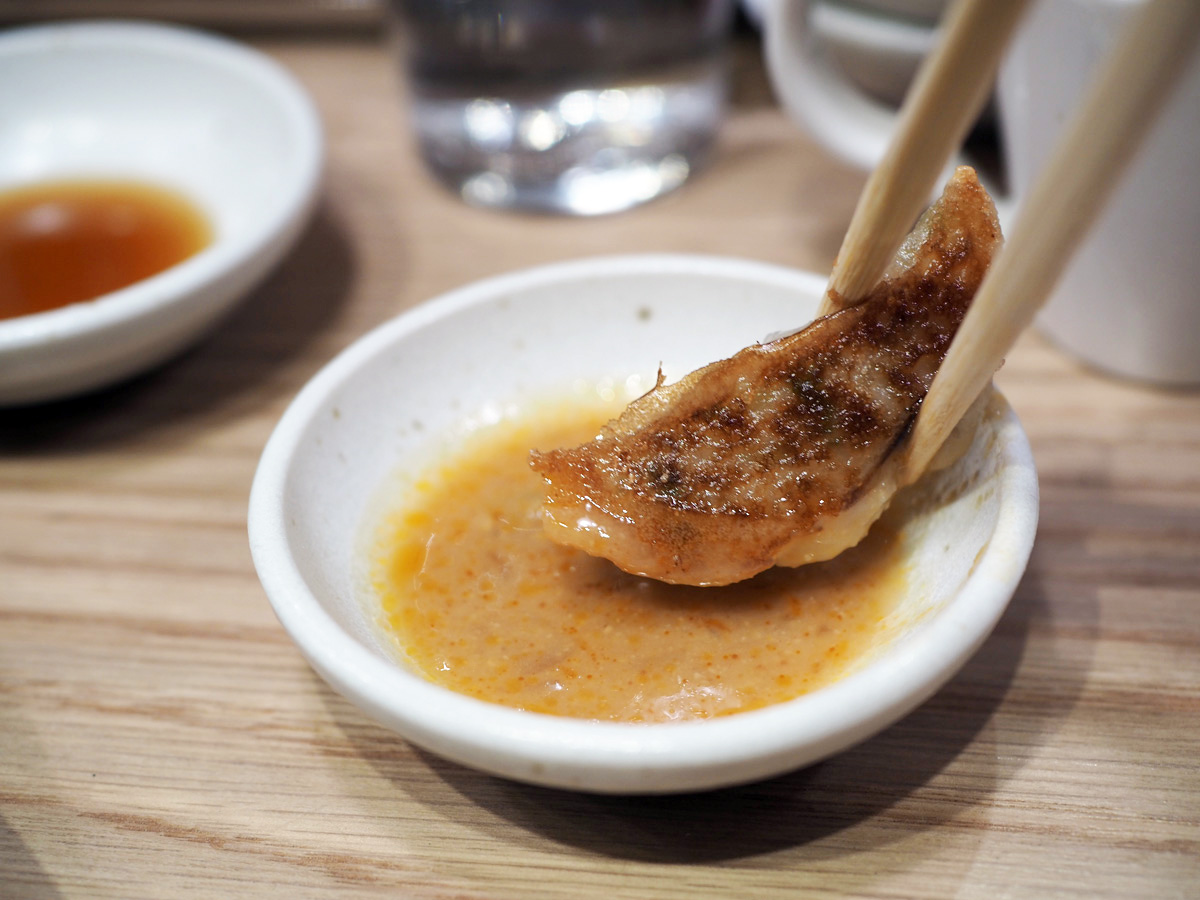 このぎょうざに合わせたいのは、とろりとした特製の味噌だれ。刻んだ野菜が入った少しだけピリ辛の味噌だれがよく合います。