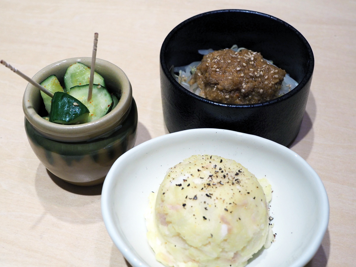 サイドメニューは5種類のみという潔さ。写真は壷きゅうり350円、ポテトサラダ400円、肉味噌もやし450円です。すぐに出してもらえるので、ぎょうざを待つ間にどうぞ。