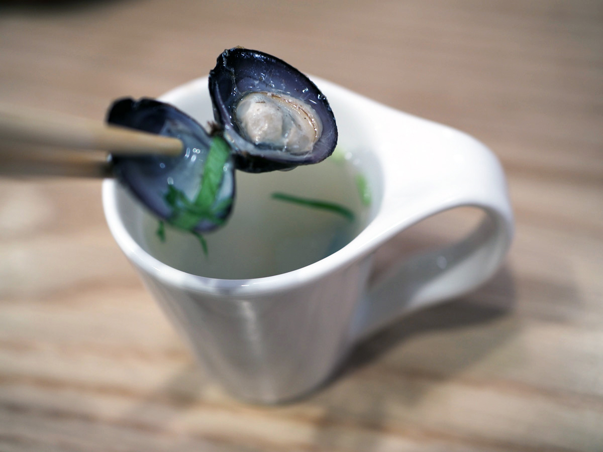 お酒好きにおすすめしたいのが、鬼しじみのエスプレッソ350円。大きな鬼しじみの濃厚なエキスが抽出されたスープが内臓にしみます。飲んだ後に飲みたいスープ。ほかに、鶏肉がごろごろ入った、鶏と生姜のスープ450円もあります。