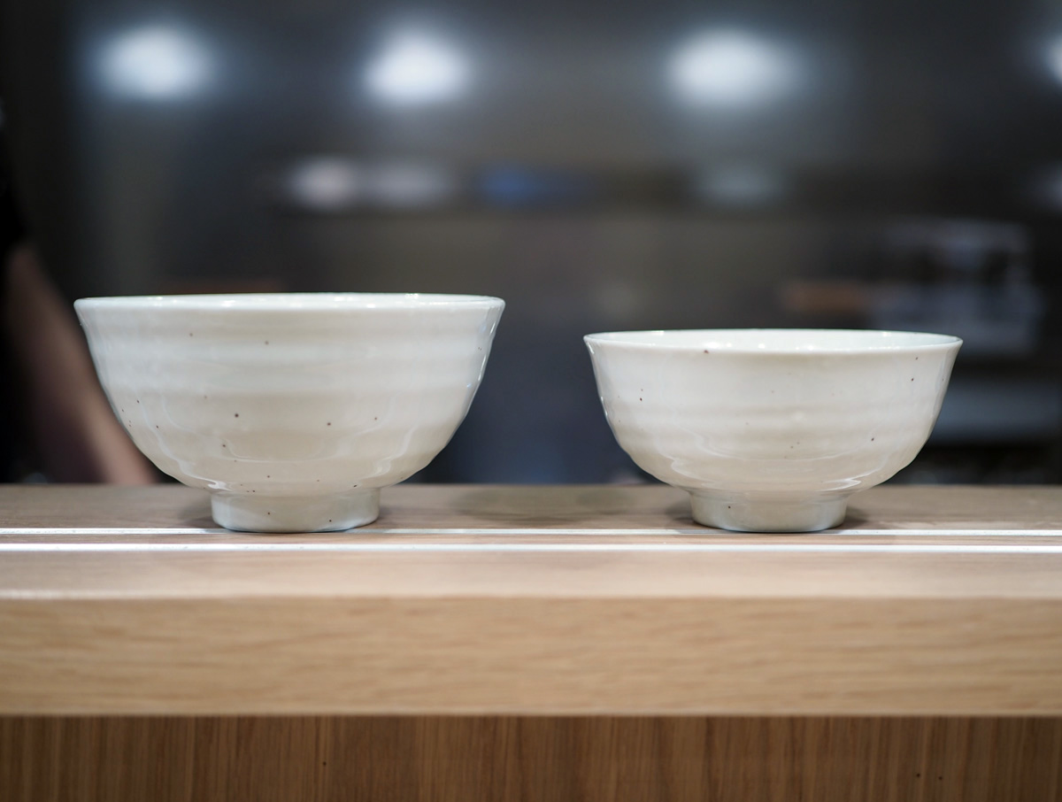 ぎょうざといえば米!という人には、もちろん白ごはんもあります。小100円、中200円、大300円。写真は左が大のお茶碗、右が小のお茶碗です。