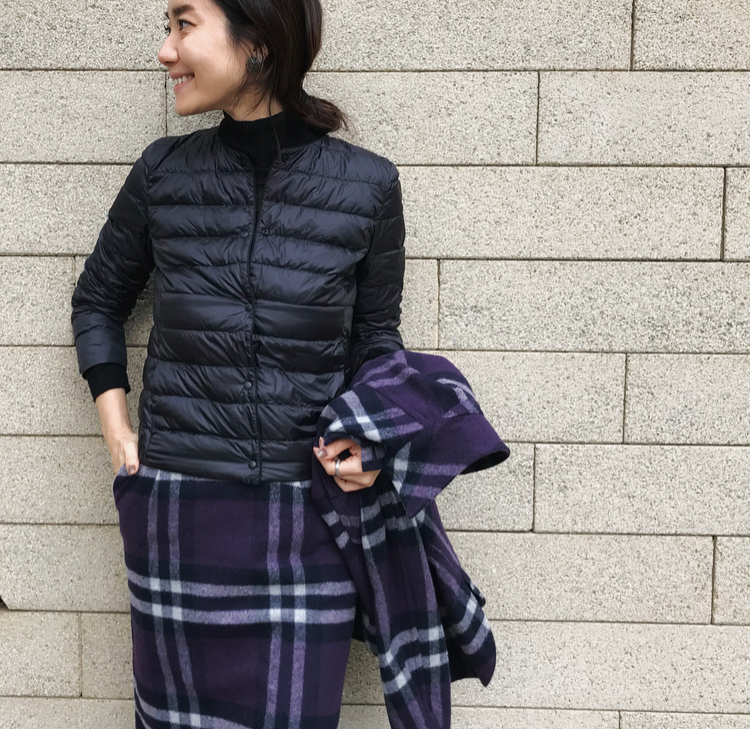 私が愛用しているのは、おなじみUNIQLOのウルトラライトダウン。脱いだときも軽くて邪魔にならないし、それでいて、一枚で本格派コートに引けをとらない暖かさなんです。ダウンの襟元は、内側のボタンをとめればVになるので、ジャケットの下に重ねるときはVネックにしてベスト風にアレンジ。もちろんそのまま一枚で着てもサマになります。今季、スポーツテイストがトレンドなので、防寒性だけでなく、コーディネートの鮮度も上げてくれる嬉しいアイテム。