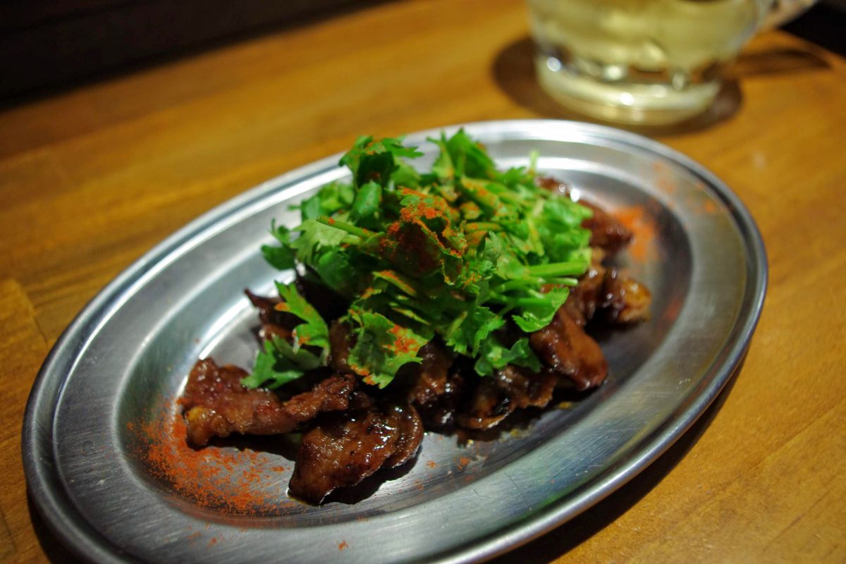 ラムパクチー(880円)は、パクチーの鼻に抜ける香りがラムの濃厚な味わいと絶妙に絡み合う一皿。おつまみとして人気のメニューで、ハイボールとの組み合わせは抜群です。