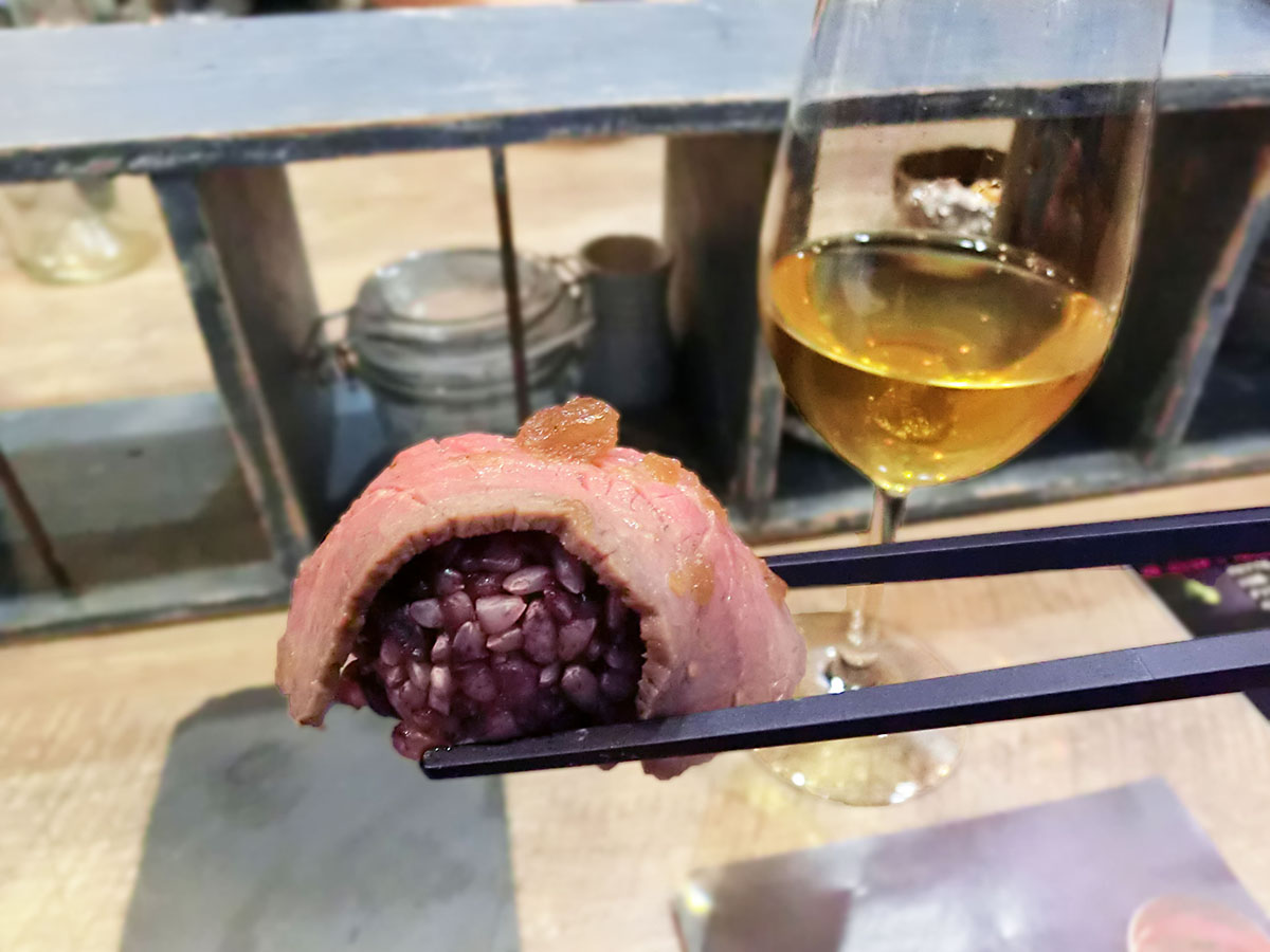 こちらはコースのメインとなるローストビーフのおむすび。玄米と黒米を混ぜたプチプチした楽しい食感です。