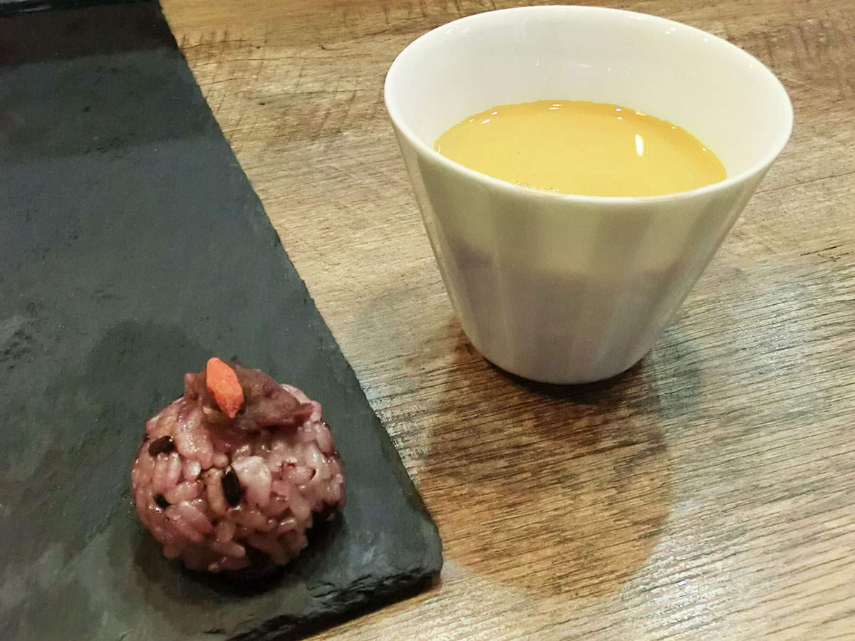 写真はコースのスープに位置づけられている黒豆入りの梅のおむすびで、おしゃれなお茶漬け仕立てにしていただきます。なんとそのお茶がマスカット、パイナップル、マンゴー、白桃などフルーティな香りの温かい紅茶!意外にも梅の爽やかさと相性抜群です。