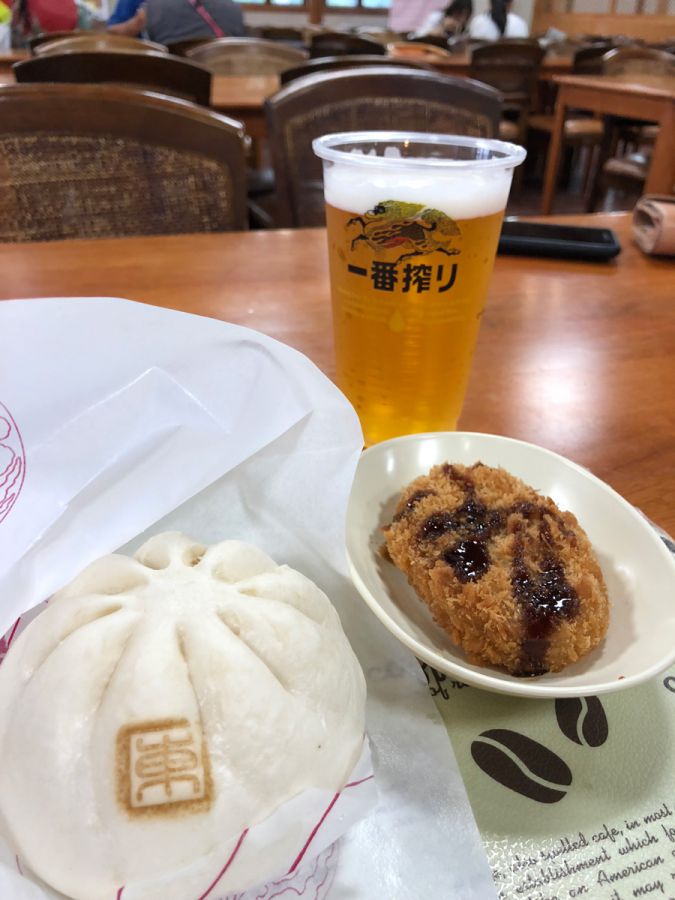 立山駅に戻ってきて、是非食べていただきたいのが白えびコロッケ。サクサクの衣に富山湾の宝石とも言われる白えびがたくさん入っていて、とっても美味しいんです。思わずビールも進みます。
