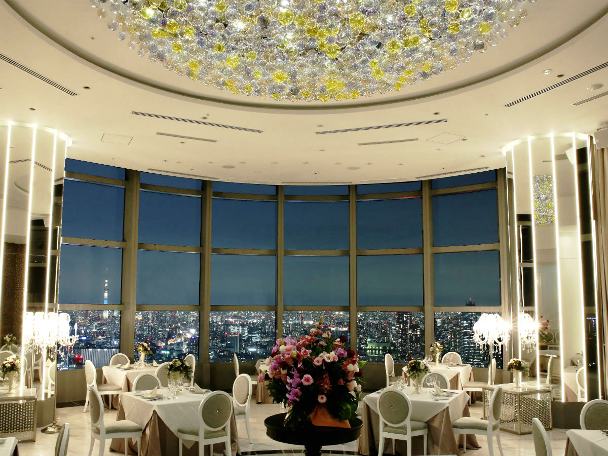 地上210m、270度を超えるパノラマビューで、まるで夜空を飛んでいるかのような気分になれる「HORIZON TOKYO」。こちらのお店は、どの席からでも夜景を楽しめるようになっているので、絶対外せない特別な日のデートにもぴったり。大きなシャンデリアや、高い天井と大きな窓、ラグジュアリーな雰囲気に気分が上がります!