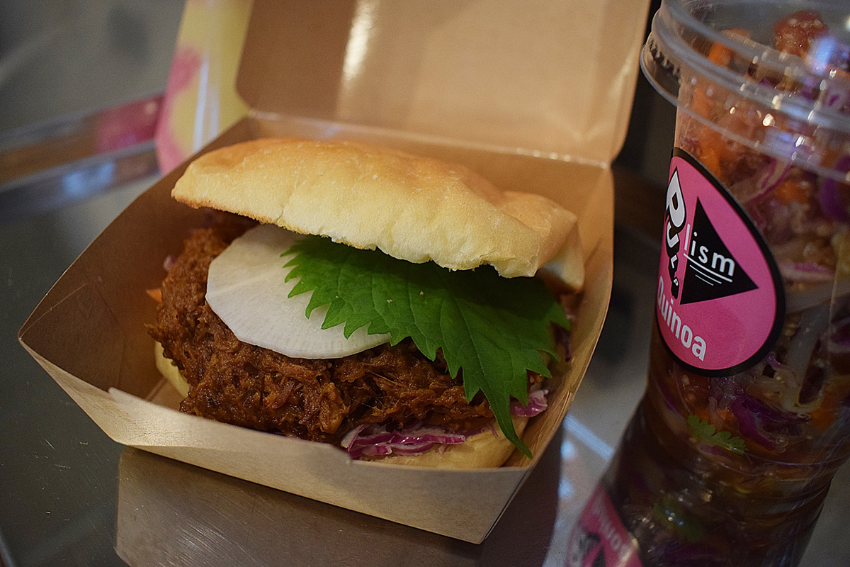 特徴は、宮崎産のSPFポークを使ったプルドポーク。プルドポークとは、あらかじめスパイスに漬け込んだ豚肉を火入れしたのち、食べやすく割いたものです。アメリカ・テキサスで食べられているものなのだとか。