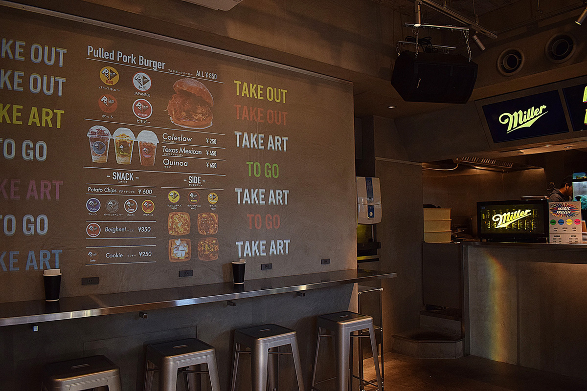 店内は海外に来たかのような雰囲気。外国人が多いエリア、メインメニューがハンバーガーということもあり、アメリカンテイストにしたのだそう。打ちっぱなしのコンクリートに、壁面に映し出される英語中心のメニューなど、スタイリッシュな店内です。