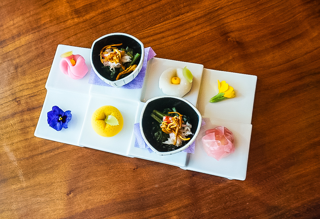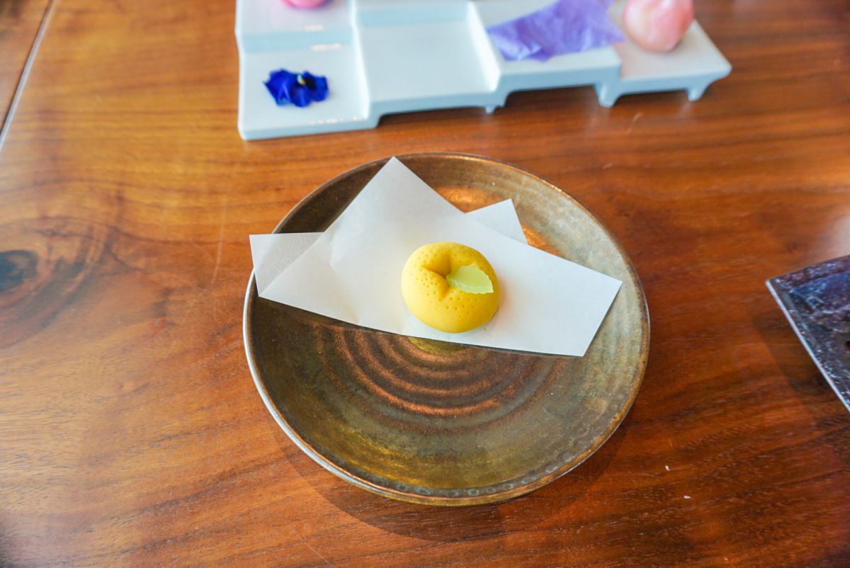 「華凛〜Temarisushi〜」の中で、忘れてはいけないのがこちら!本日のお浸しとともに別皿で供される和菓子のデザートも、アーティスティック。冬のメニューでいただいた柚子やお花に見立てた練り切りは、とっても繊細で食べるのが惜しくなるくらいでした。