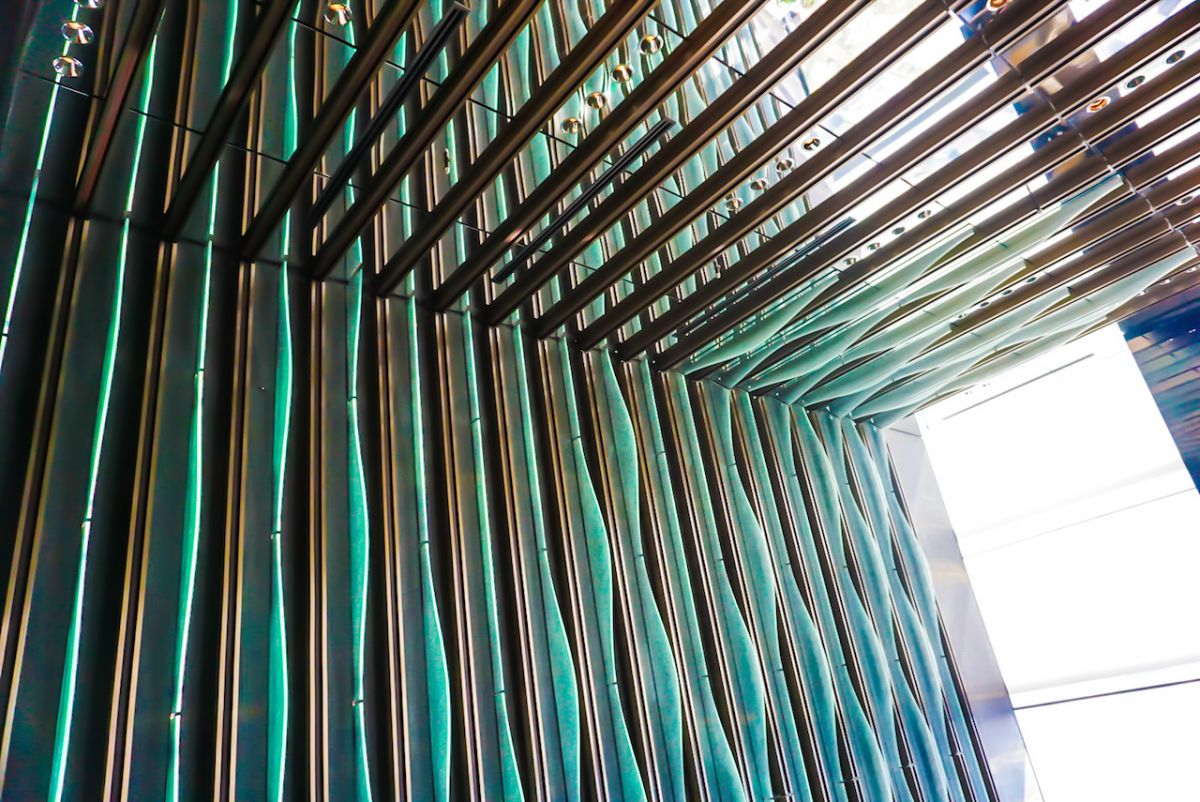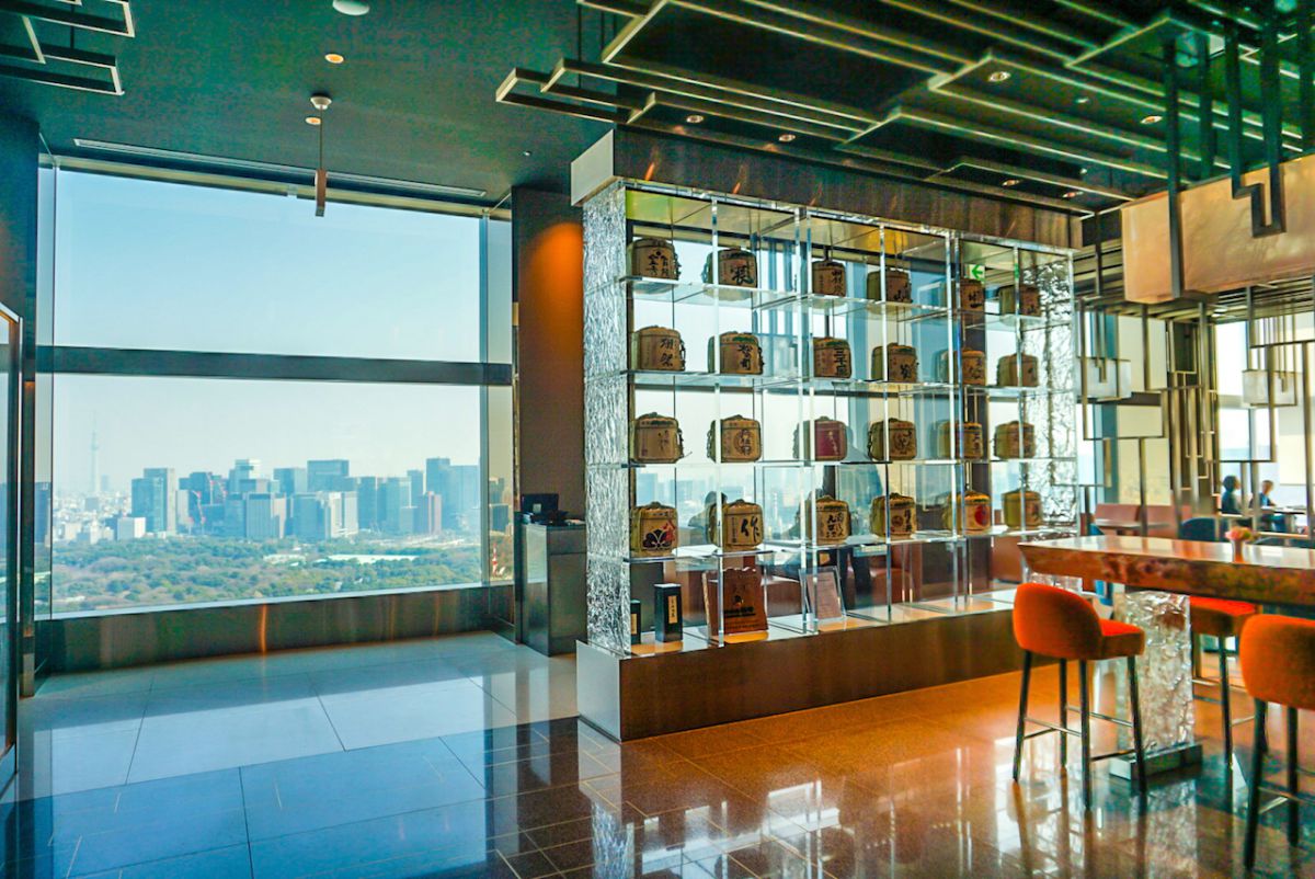 36階のスカイロビーは、高層階ならではの眺望に吹き抜けが印象的な、グリーンのグラスアートが彩る空間。そこから螺旋階段を下りた35階に広がる開放的なメインダイニング「WASHOKU蒼天 SOUTEN」が、本日のお目当てのお店。