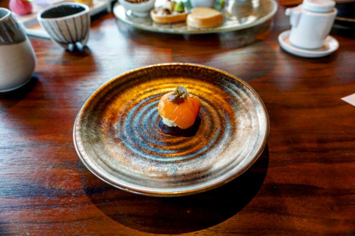たとえば、晩秋に訪れた時に一番気に入ったのは、柿に見立てたサーモンの手まり寿司。まさに芸術作品。ひとつひとつの手まり寿司が可愛くて、愛おしい。