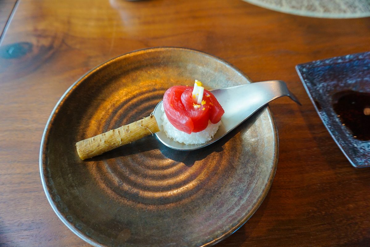 また、2017年の冬メニューでひときわ目を引いたのは、椿に見立てたお寿司。鮪と大和芋、黄身おぼろが椿に表現されるなんて。下はシャリではなく、氷餅。赤と白を噛み締めながらいただきました。