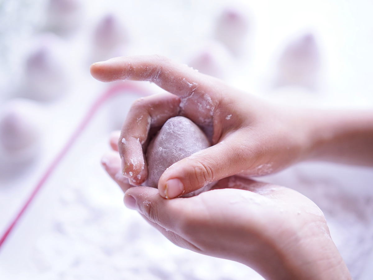 ②で作ったいちごあんにお餅を乗せて、手のひらの上で優しく転がします。お餅を指全体で下に送る感じです。べたべたするので、片栗粉をまぶしながら形を整えてください。