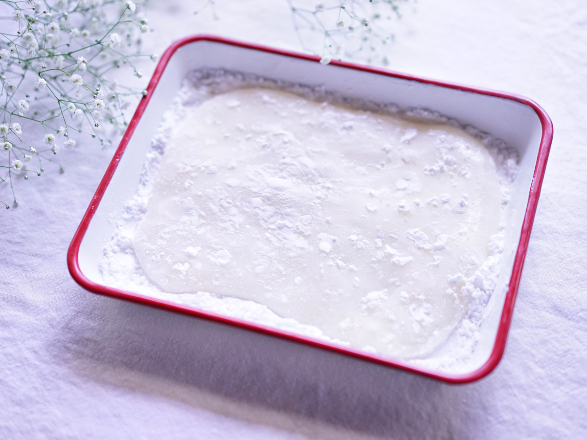 片栗粉を入れたバットに、お餅を取り出します。上にも片栗粉をまぶし、長方形に伸ばします。