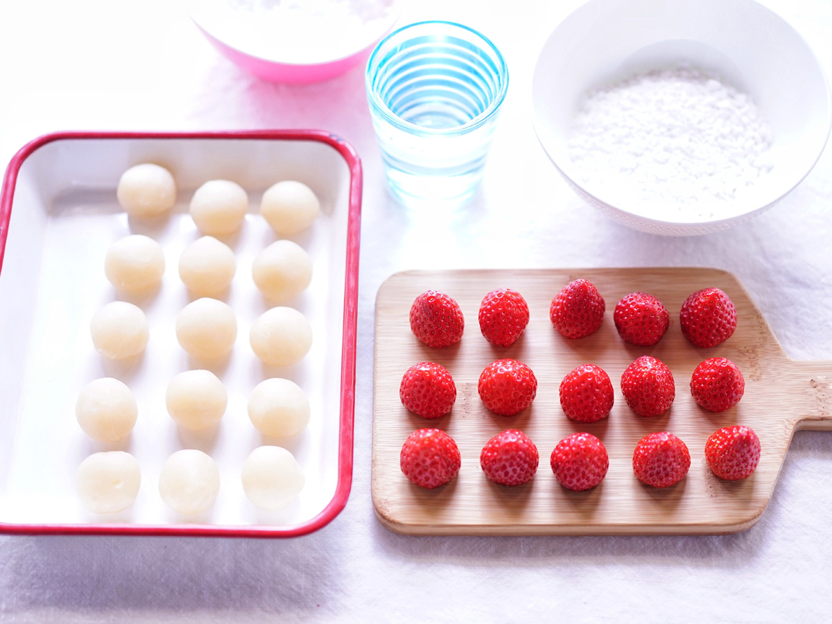 | 材料/15個分 いちご…15個 白あん…300g 白玉粉…100g 水…150g 上白糖…200g 片栗粉…適量 |