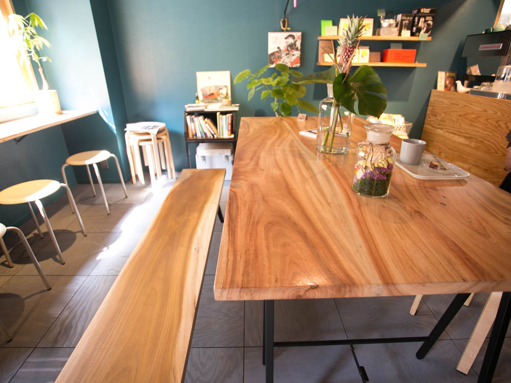 店内に入るとまず目に飛び込んでくるのは、存在感のある大きなテーブル。屋久島の、楪(ユズリハ)という木を取り寄せて作られたものだそうです。