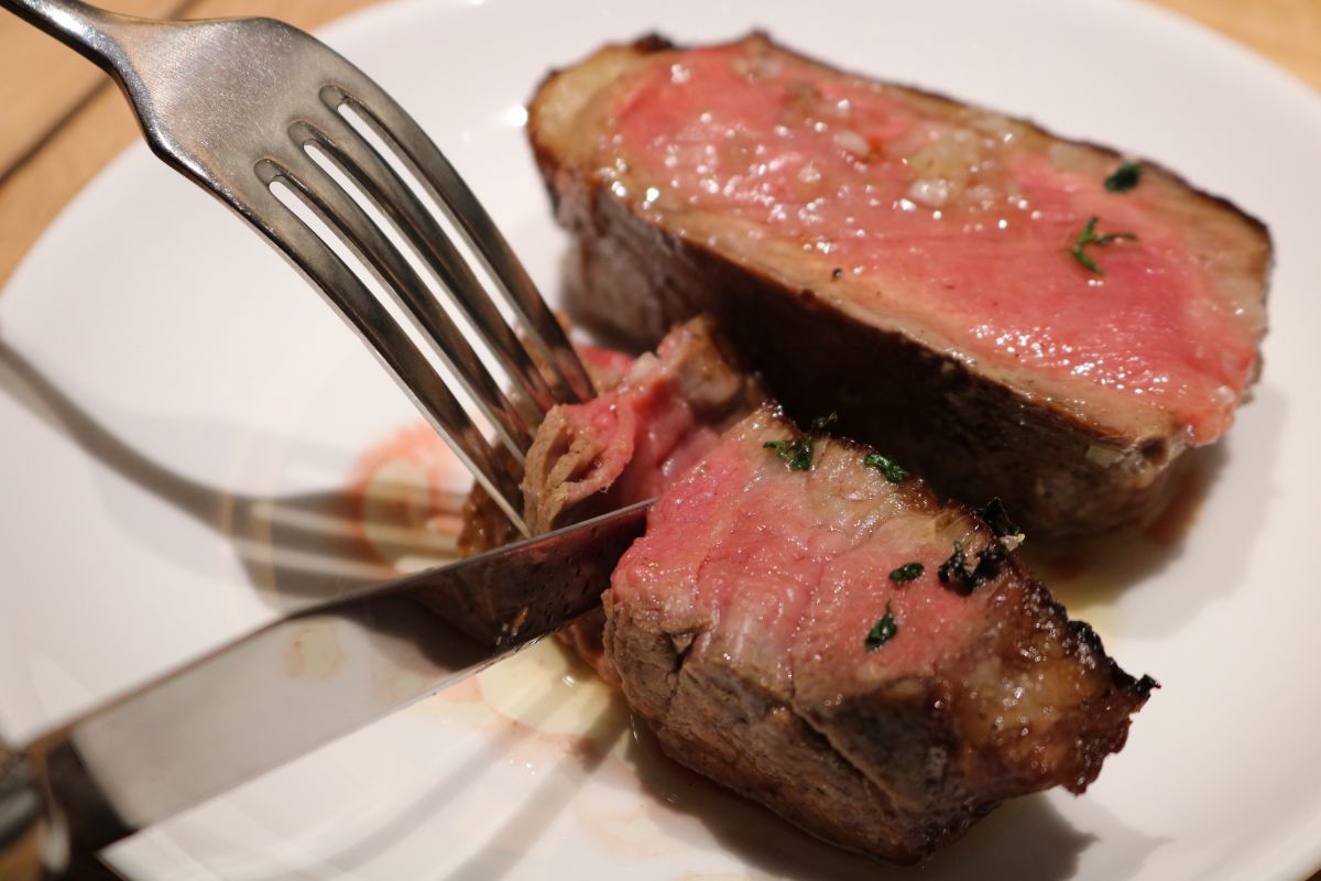 油もバターも使わず、1滴の肉汁も逃さずに焼き上げた塊肉にソースで焦がしバターの風味を加えているので、これだけの量がありながら、食感はあっさりしていて、どんどんいけます。Tボーンなので、1皿でヒレ肉とロースを両方味わえるのもお値打ち。