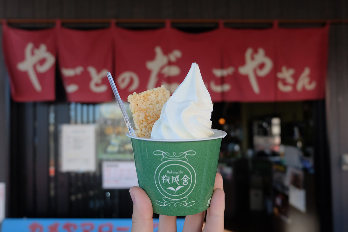 テイクアウトもできる「ソフトクリーム」(350円)は、飛騨高山で大人気の“牧成舎”のアイスを使用。おこげと一緒に食べると相性抜群です!