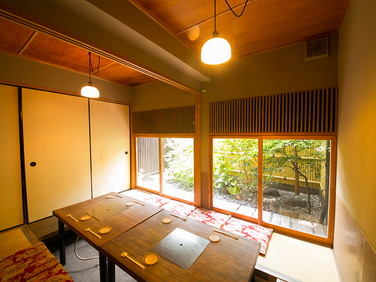 大正時代の町屋の趣を残した、京都らしい風情の「隠」。京都牛や京野菜、生麩や湯葉など、京都ならではの食材を、全席掘りごたつ個室(カウンター席を除く)でいただけます。「ステーキがメインの『おすすめお任せコース』」は6480円(税・サービス料込)。