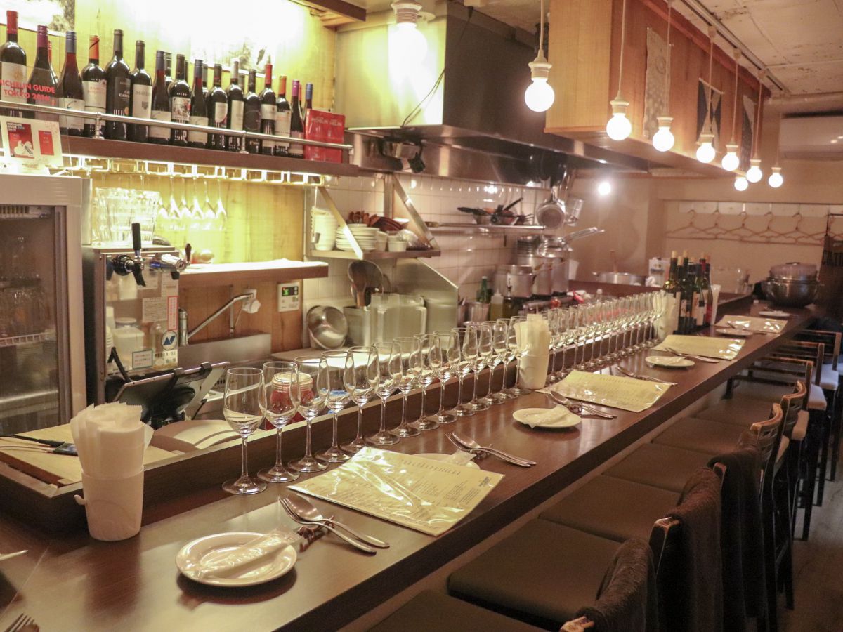 こじんまりとした店内は、厨房をぐるりと囲むようにカウンター席が18席あるのみ。目の前で手際よく料理が作られていく様子が見られるのは、ライブキッチンのようで臨場感も楽しめます。