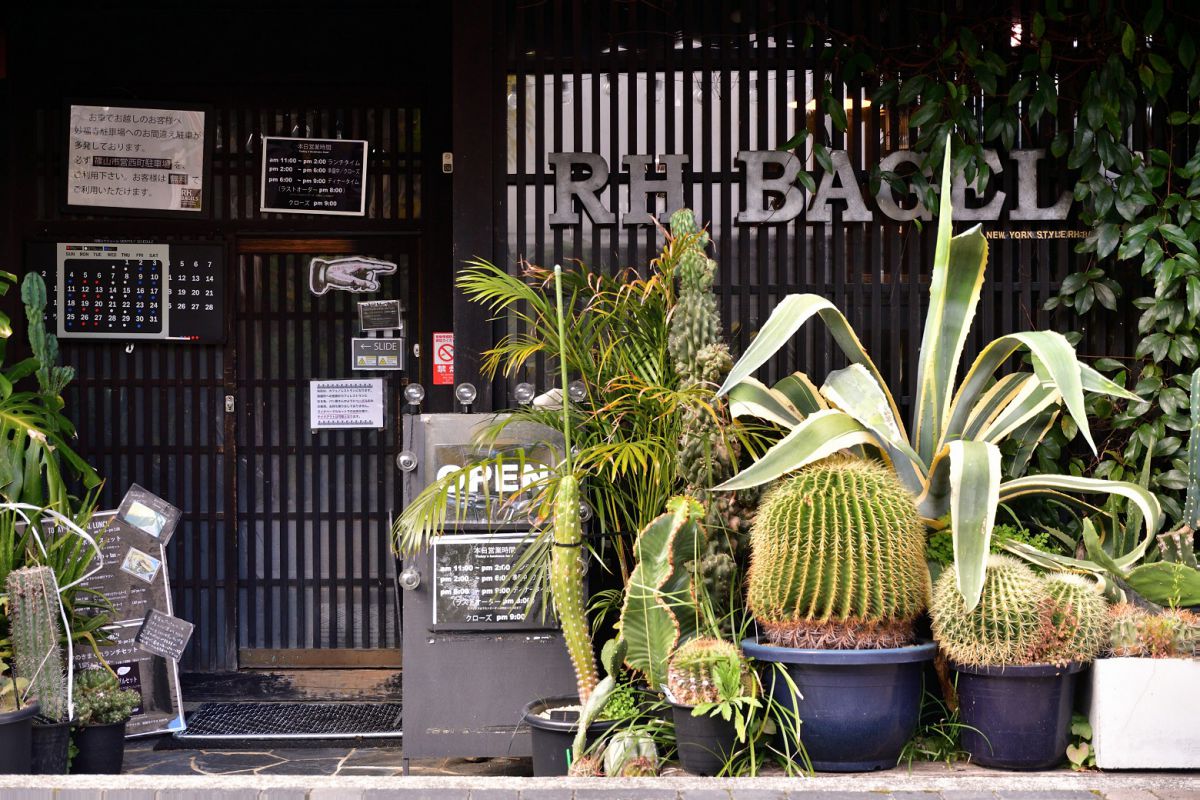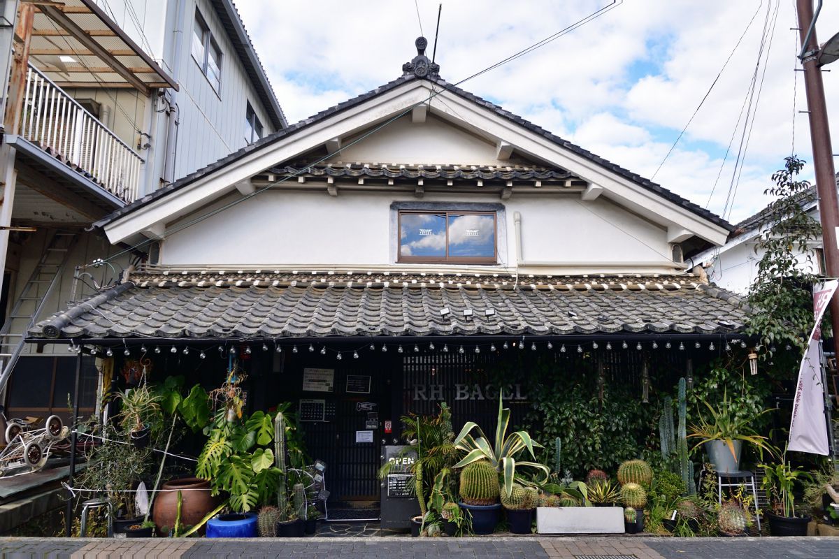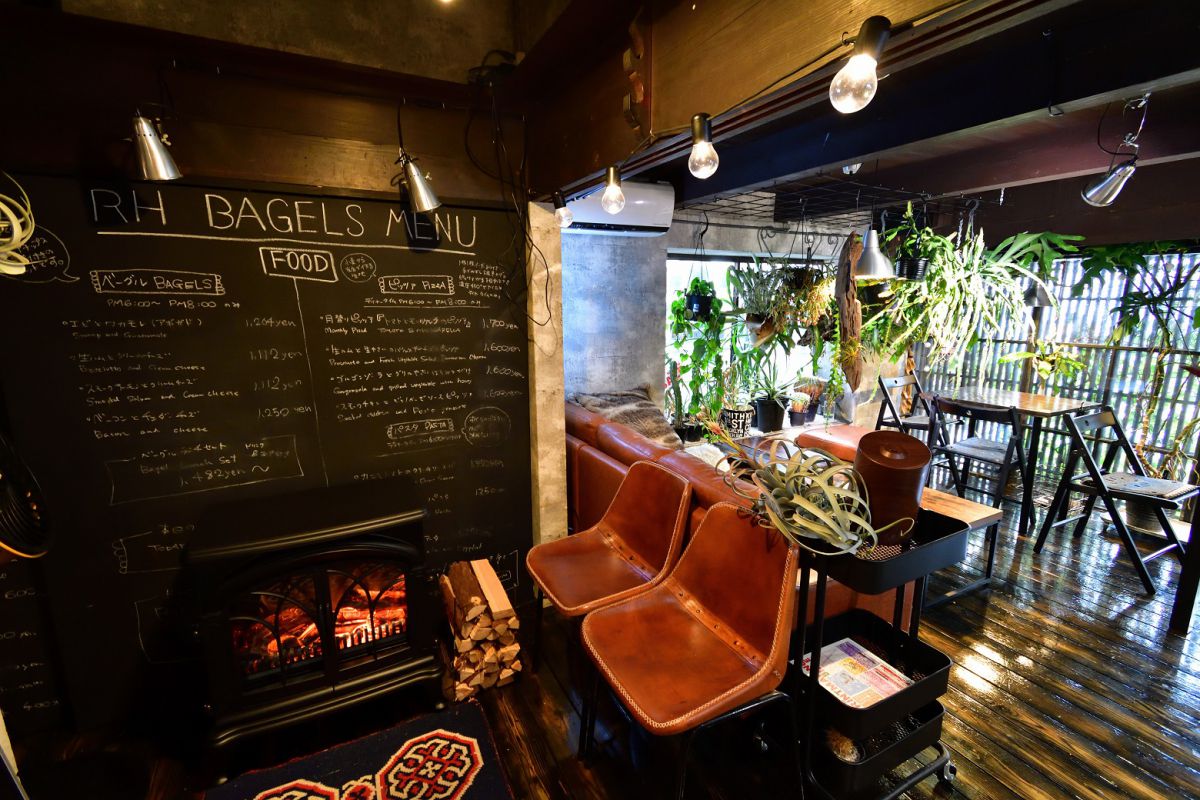 緑豊かな兵庫県・篠山市にある、古民家をリノベーションしたカフェ「RHベーグル」。看板商品のベーグルランチは、サンドできないほどたっぷりの生野菜とグリル野菜に驚きです。フライドポテトも一緒に木のボードで提供され、なんとも豪快な見た目。たくさんの観葉植物が吊り下がる、店内のムード漂う世界観も魅力です。