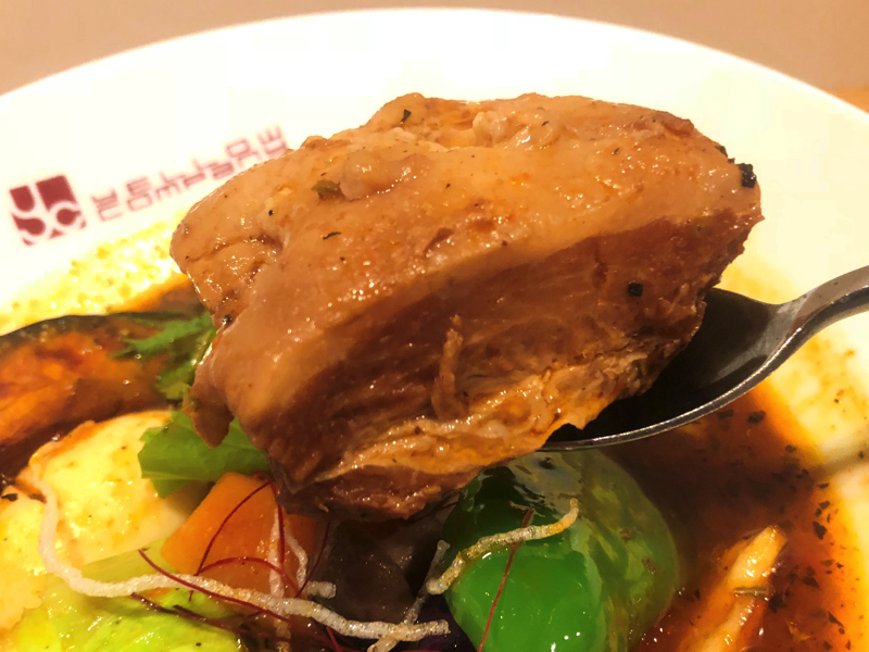 「豚角煮&ベジタブル」には、たっぷりの野菜と大ぶりの角煮が入っています!角煮は、持ち上げるとずっしりと重さが伝わるほどボリューミー!そして、お箸を入れるとスッとほぐれるほど柔らかく煮込まれています。口に入れた瞬間、ジュワっとカレーの旨みがあふれ出て、脂のくどさもなく、超絶品!